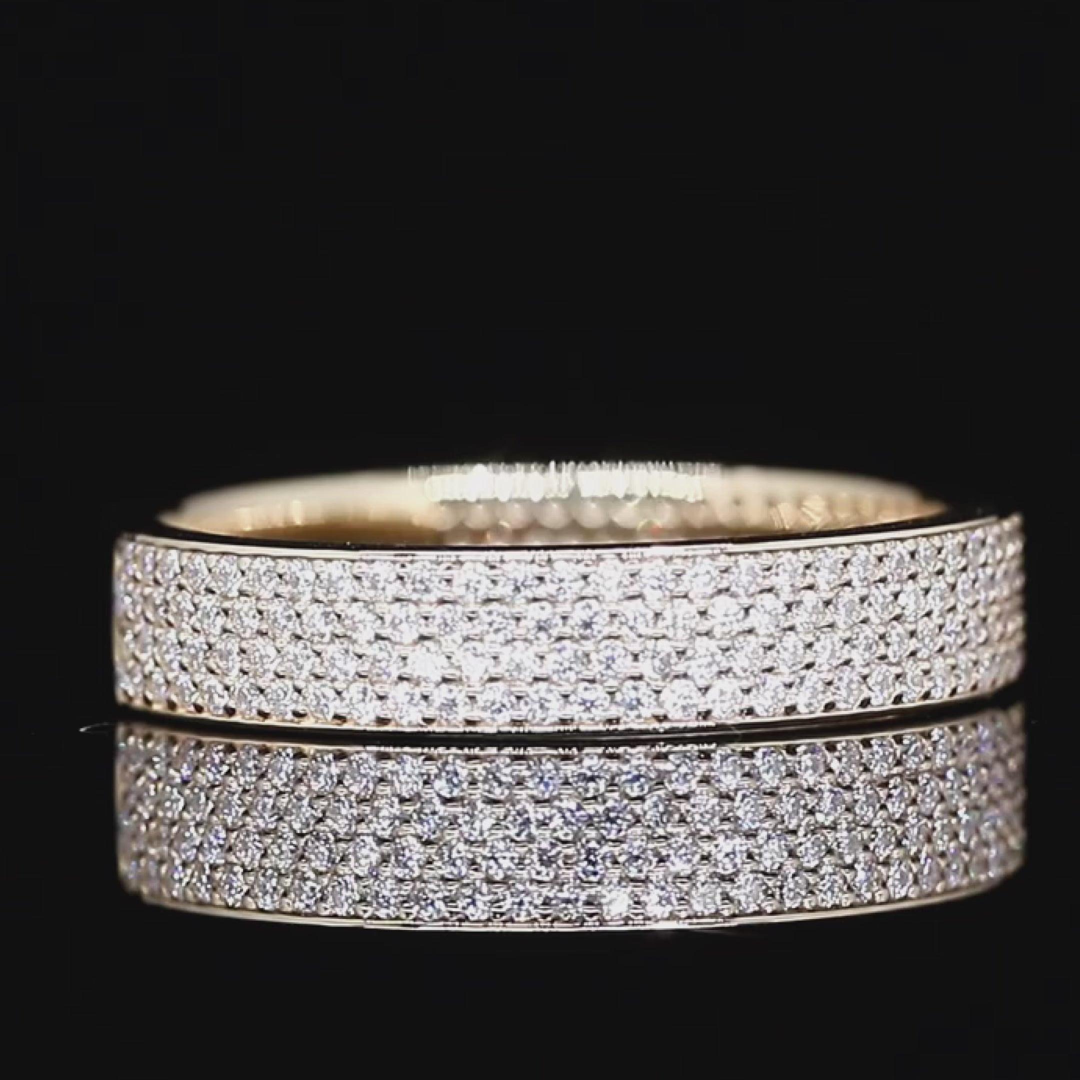 A polished 10K solid gold band is refined with three continuous rows of pavé-set VVS stones, each chosen for its clarity and light. Precise, balanced, effortlessly elegant — a modern expression of commitment and style.