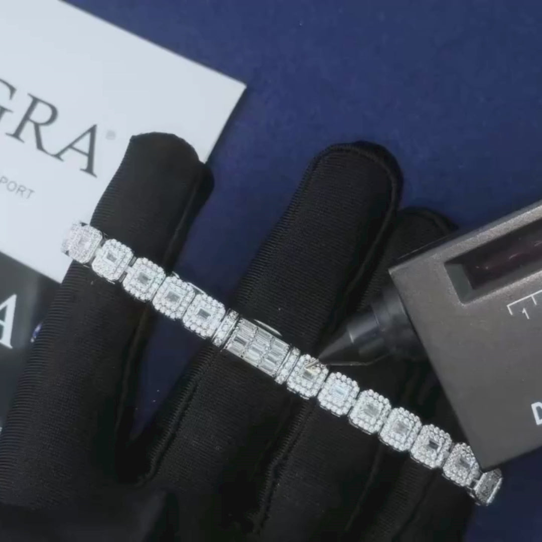 Precision forged, unapologetically bold. The Maison Royale Bracelet mirrors the sharp geometry of its counterpart chain—featuring pavé-set moissanite stones in squared formation, built to catch light without saying a word. Its low-profile silhouette sits flush against the wrist, delivering presence with restraint.