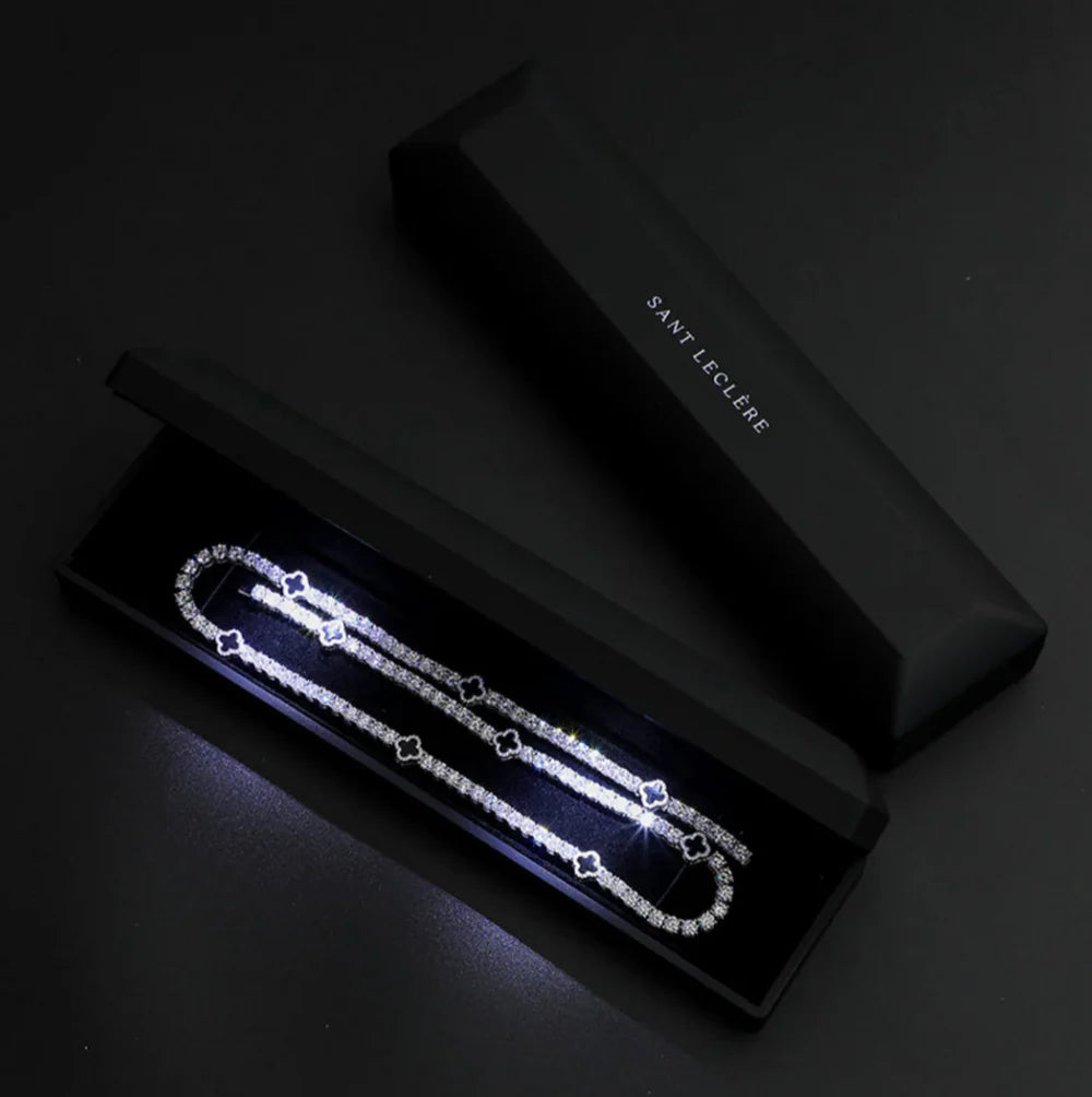 Timeless sophistication, redefined. Crafted in lustrous white gold, this bracelet features a seamless row of black clover links, each adorned with brilliant-cut stones—a symbol of refined luxury and effortless confidence.