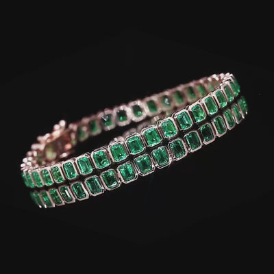 Inspired by the serene meeting of dawn light and untouched nature, the Forêt Rosée bracelet unites the cool depth of emerald with the soft radiance of rose gold. Each Asscher-cut stone — defined by its architectural precision — is framed in a continuous line of rose-toned gold, reminiscent of sunlight weaving through a forest at first light.