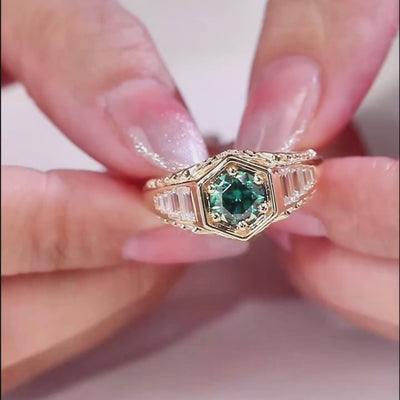 A round brilliant green gemstone is set within a distinctive hexagonal bezel, its shape recalling the precision of a signet and the authority of a seal. Along the shoulders, stepped baguette stones introduce vertical rhythm, framed by engraved detailing that brings a sculptural depth to the piece.