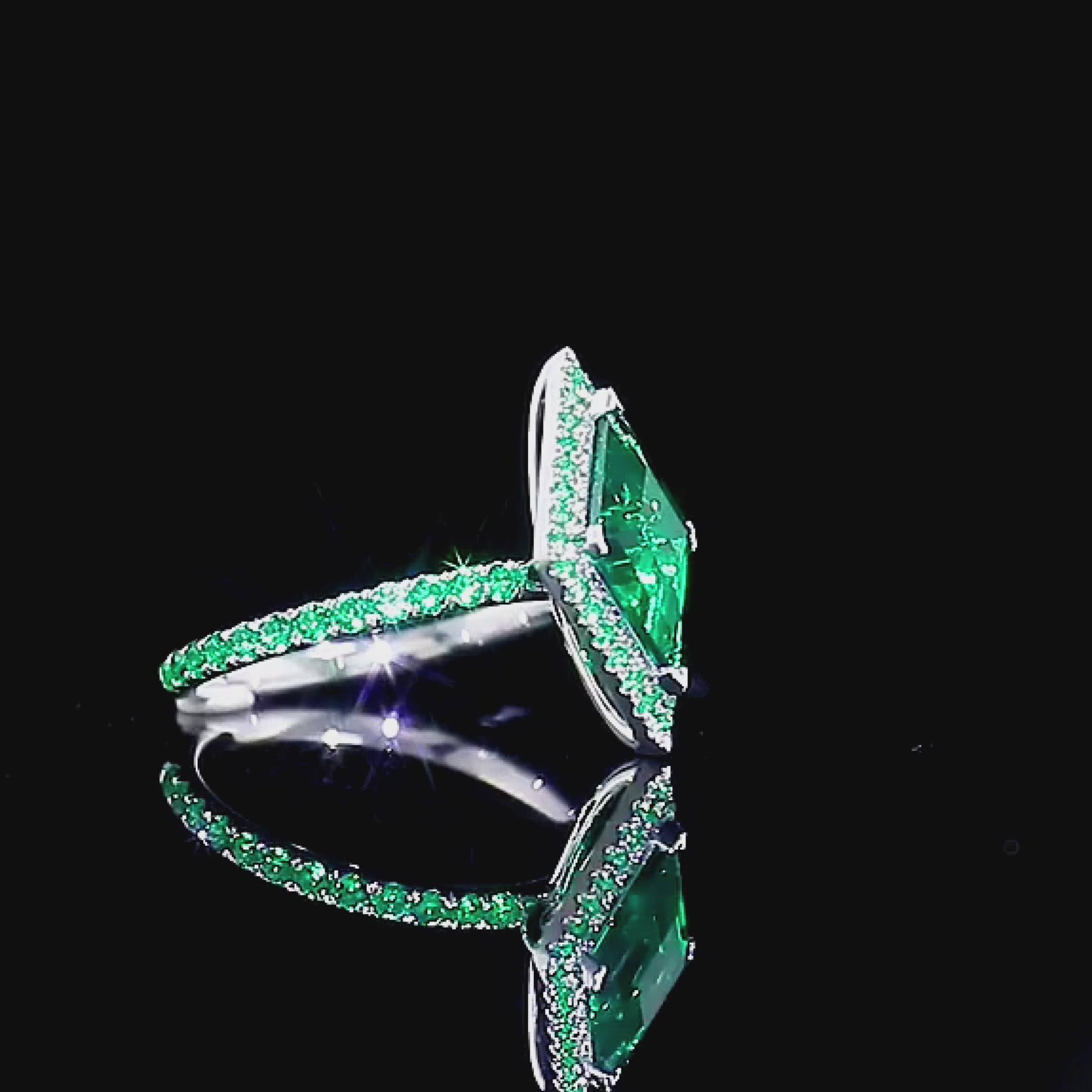 - Main Stone: Emerald-cut Zambian lab-grown emerald (6×12 mm)