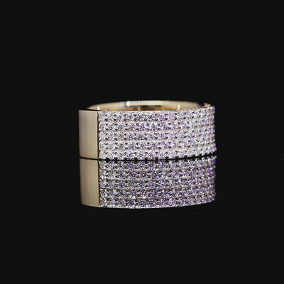 A bold band of 18K yellow gold forms the foundation, its generous profile carrying over 2.5 carats of natural F-colour diamonds, each precisely laser-set in multiple rows of immaculate pavé.