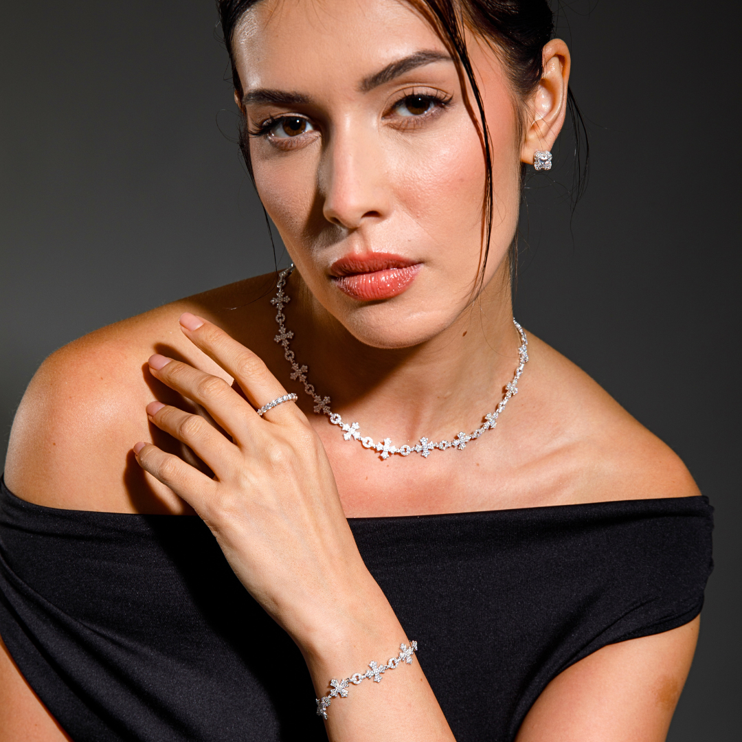 Each stone is selected for its exceptional clarity and brilliance, then set to ensure light flows seamlessly across the piece. The result is a creation that radiates with controlled brilliance.