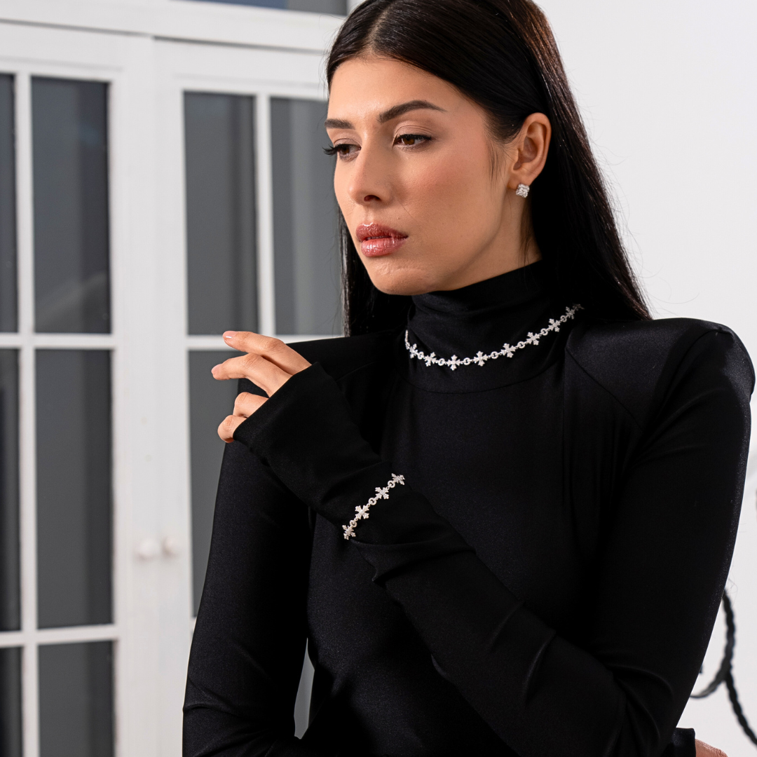 A composition of symmetry and light, La Croix Lumière expresses Sant Leclère’s devotion to refined craftsmanship and enduring design. Each cross motif is meticulously set with VVS-grade moissanite stones, arranged to capture brilliance from every angle and create a quiet yet unmistakable radiance.