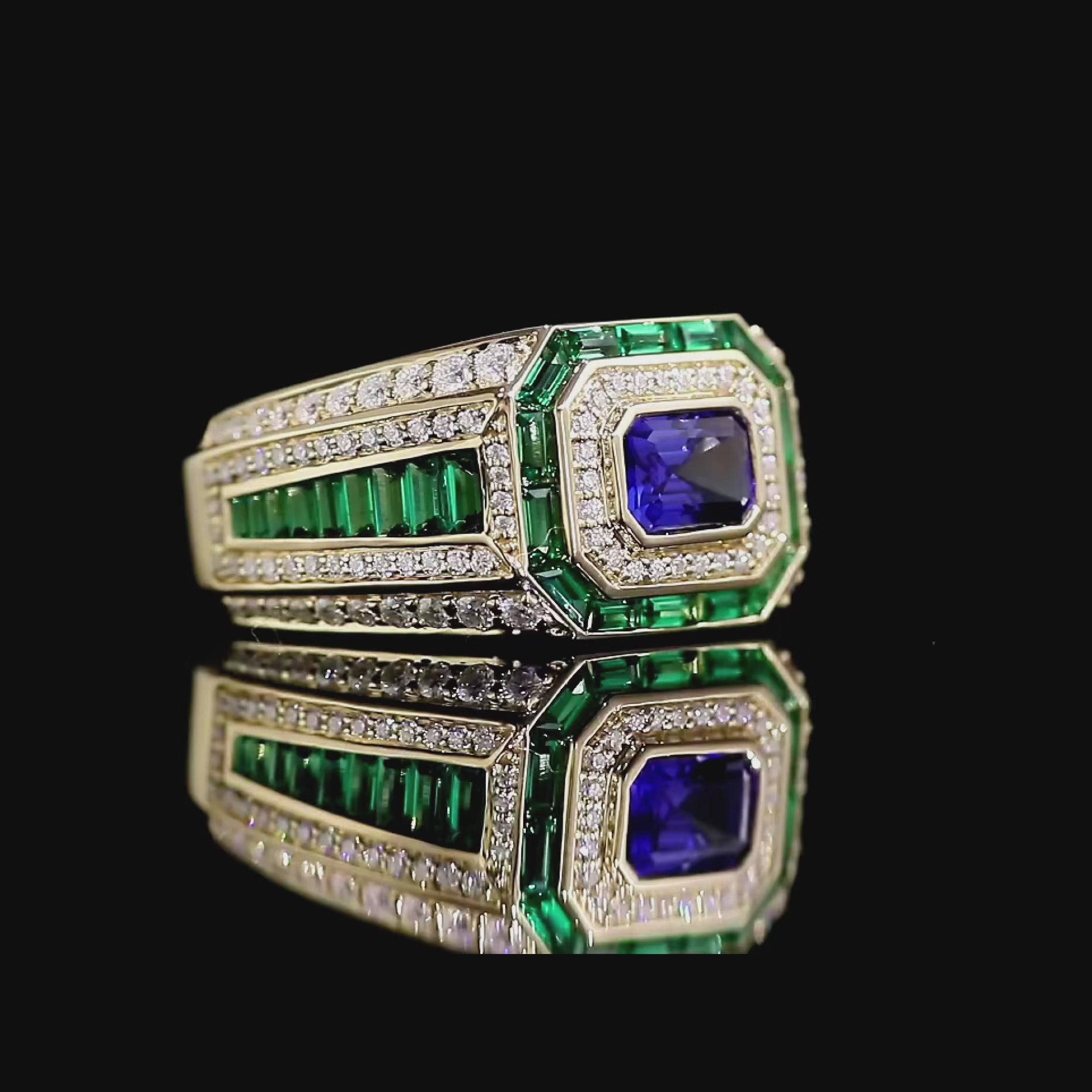 Inspired by the symmetry and grandeur of classical architecture, the Le Panthéon ring is defined by its strong geometric lines and bold interplay of color. A deep central stone anchors the design, framed by precise rows of emerald-toned baguettes and pavé-set brilliance. Each facet is positioned with intention, echoing the balance and order of the monument from which it takes its name.
