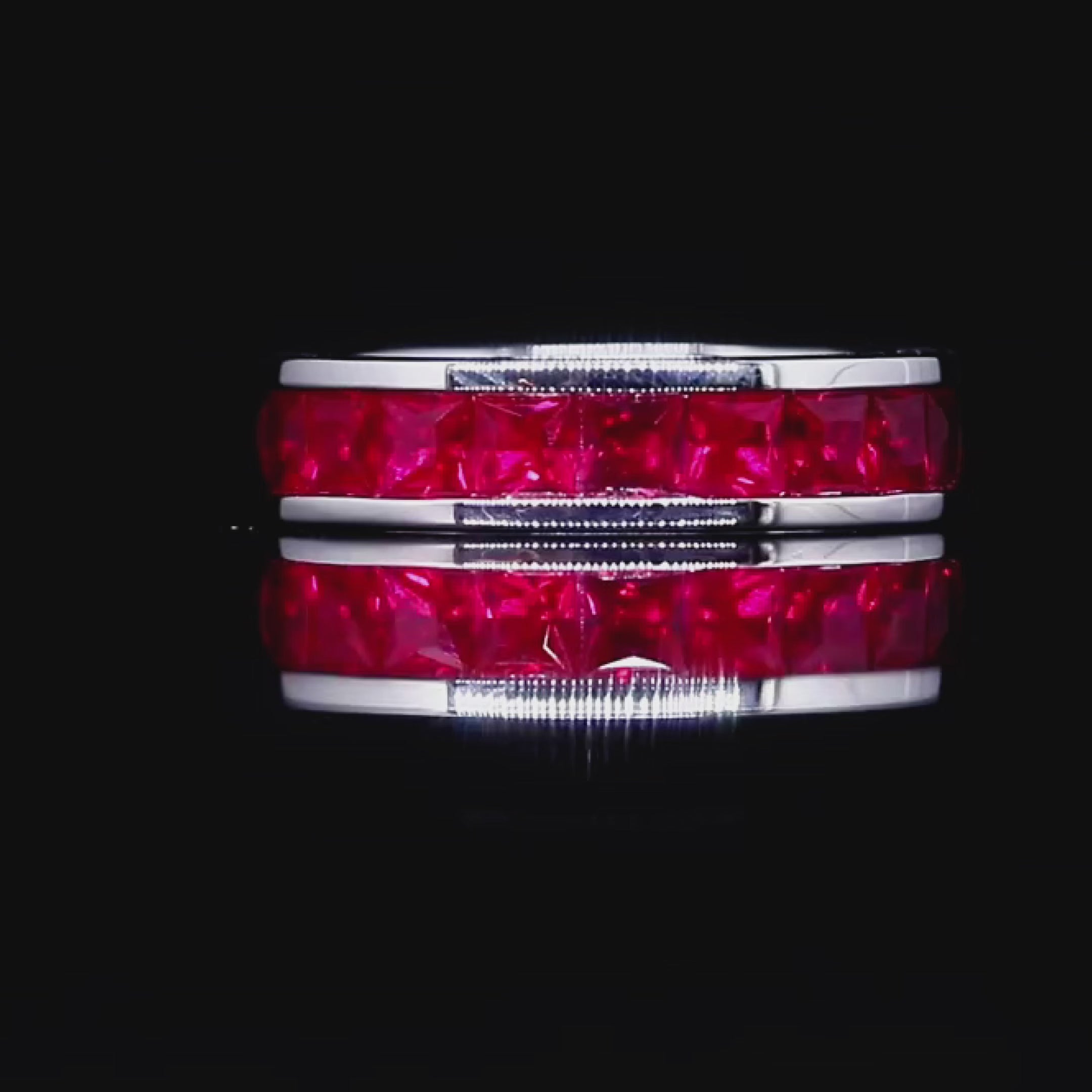 A continuous band of deep ruby Princess-cut stones is held within a sculpted white-gold bezel — a modern line of colour, precise and uninterrupted. Each stone is chosen for its vivid hue and clarity, forming a ribbon of crimson light that moves with the hand.