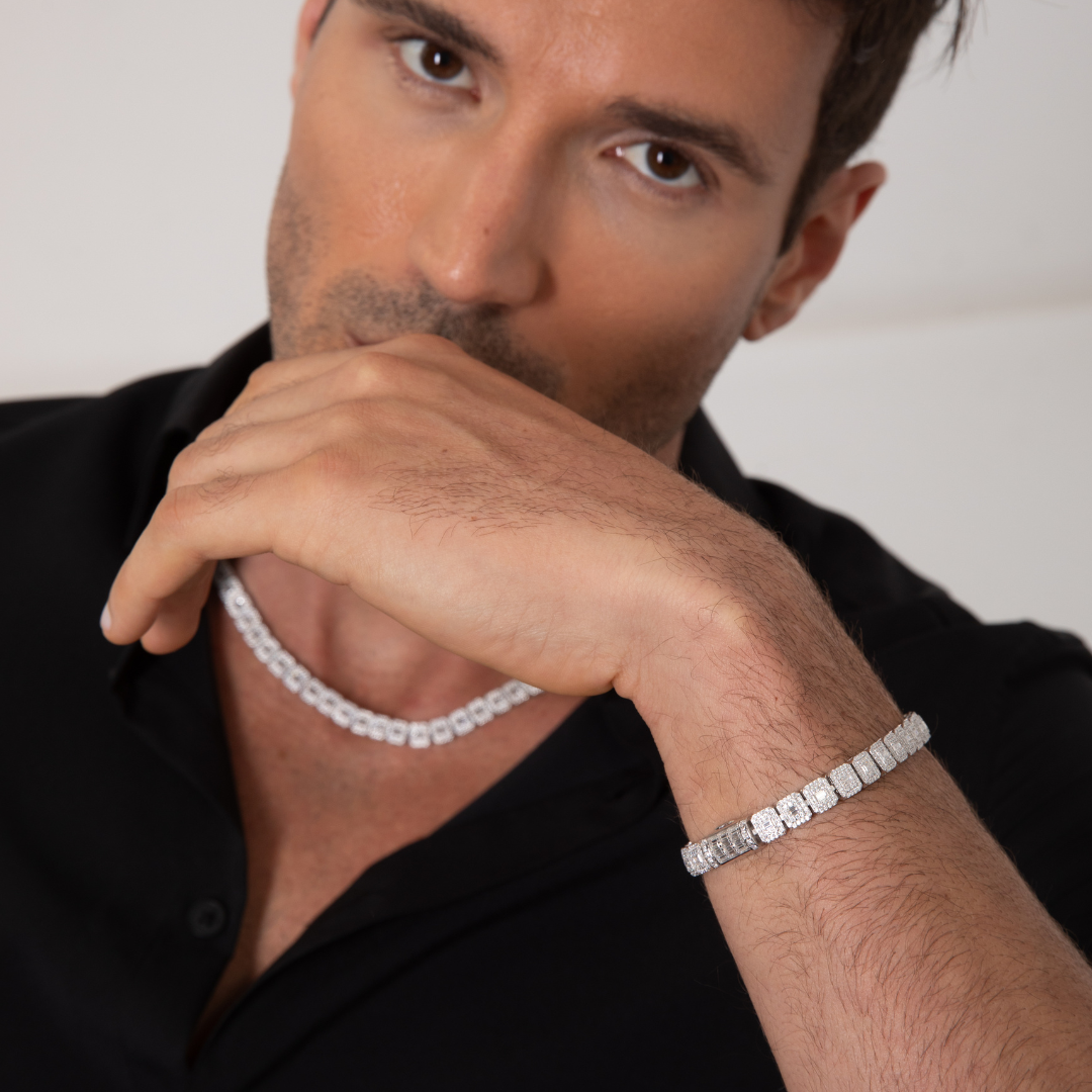 The Maison Royale Set — chain and bracelet together — is precision forged for those who move with authority. Each squared link, cut with the sharpness of baguette-set moissanite, delivers a geometry that speaks not in excess, but in mastery.