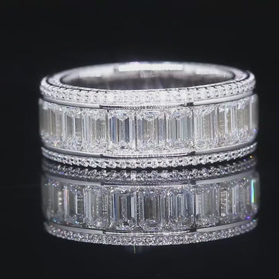 Emerald-cut stones form a continuous vertical rhythm, their elongated facets recalling glass towers and architectural lines. Framed by two pavé borders, each one hand-set in polished 14K white gold, the design creates depth, symmetry, and quiet intensity.