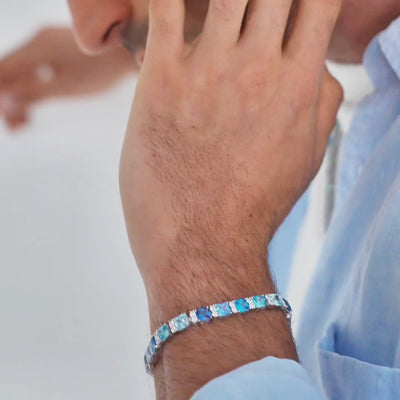 The Océan Bleu Bracelet is defined by the tension between stillness and brilliance. 89 individually set stones in continuous formation across the wrist: VVS D moissanite and precision-cut azure accents in 925 sterling silver, finished in multi-layer rhodium. At 27 grams on an 8-inch fit, it carries its presence without announcing it.