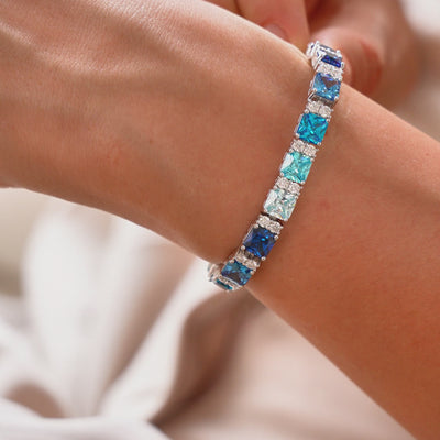 A continuous line of precision-cut moissanite stones forms the Océan Bleu bracelet. A 7-inch size features 89 individually set stones, arranged for perfect symmetry and uninterrupted brilliance across the wrist.
