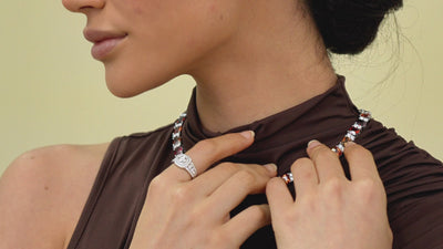 More than ornament, the Océan Rouge is fire refined. Its deep crimson stones ignite against sterling silver with deliberate force, a creation that reflects conviction and allure. Worn alone or as a set, it becomes a code of the Maison — a symbol of distinction for those who embody passion with restraint.